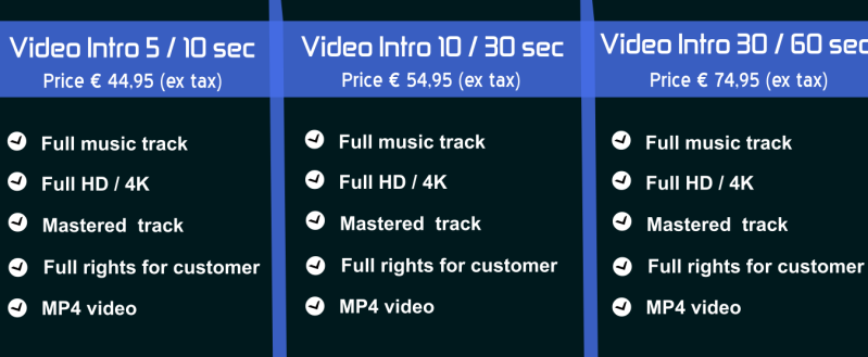 Wilt u geen standaard video intro? geen nood u kunt uw video intro ook door ons laten maken dit kan in veel soorten stylen qua video. De tarieven voor deze video intro's zijn verschillend, want hoelang wilt u de intro hebben? ook dat is mogelijk bij ons. De video intro's zijn inclusief beeld, tekst en muziek. Wij kunnen uw video intro maken vanaf 5 sec tot 1 minuut. De video intro's zijn royalty free en u krijgt van ons een licentie om deze te mogen gebruiken. Hier onder ziet u de tarieven van deze intro's .